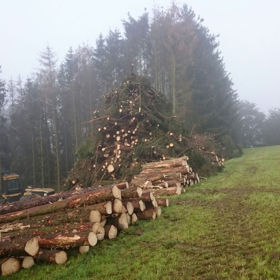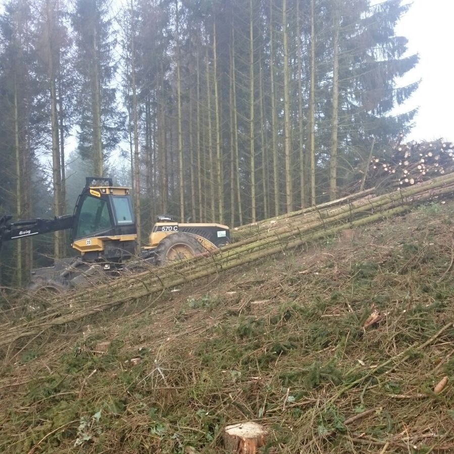Hier wurde ein Steilhang abgeerntet, bei dem die Fichten komplett mit Borkenkäfer befallen waren. Händisch zu arbeiten wäre hier äußerst mühsehlig. Mit dem Harvester wurden die Bäume umgeschnitten und nach oben (auf eine Art Wiesenplateau) gesteckt. Hier wurden die Bäume aufgearbeitet und zum Abtransport bereitgestellt.