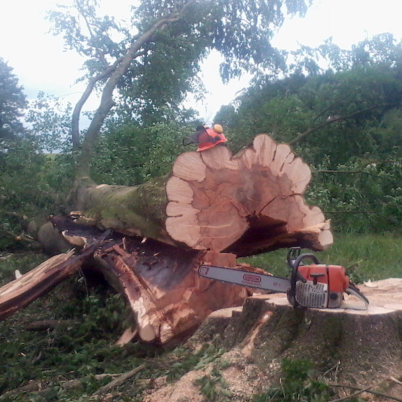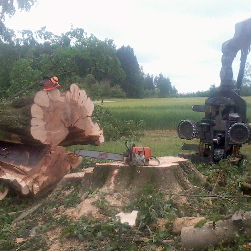 Fällung eines kranken Problembaumes. Bei so großen Stammdurchmessern kann nur manuell gefällt werden, die Technik hilft dann bei der schnellen Aufarbeitung der Einzelstücke.