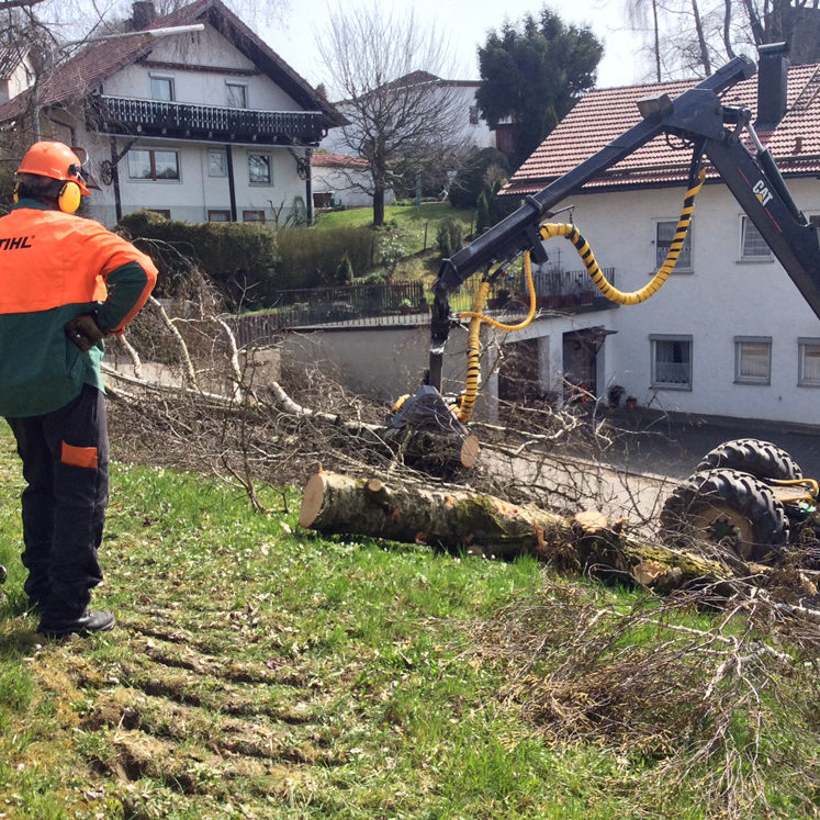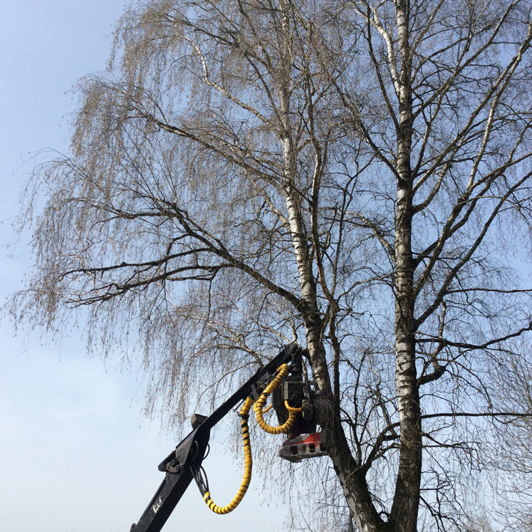Besonders im städtisch bebauten Gebiet kann es vorkommen, dass Bäume entnommen werden müssen, ohne dass eine gefahrlose Fällrichtung zur Verfügung steht. In solchen Fällen können wir den Baum mit einer Kombination aus Kran- und Hebebühnenarbeit Stück für Stück von oben her abtragen, ohne dass ein einziges Stück dabei zu Boden fällt. Damit wird der Schaden an umliegenden Gebäuden, Zäunen und Aufbauten vermieden.